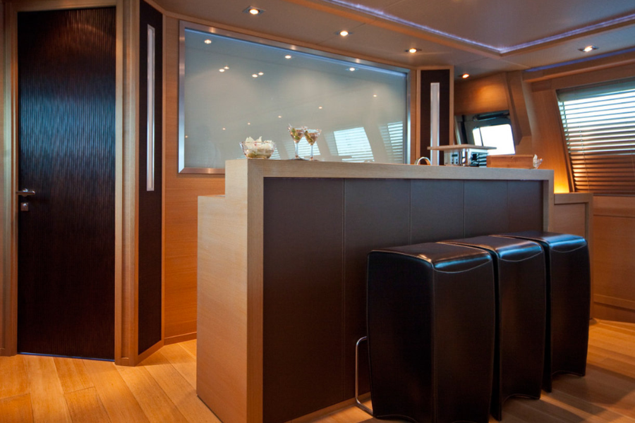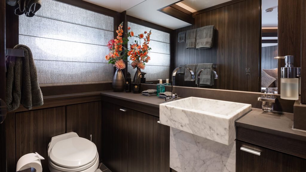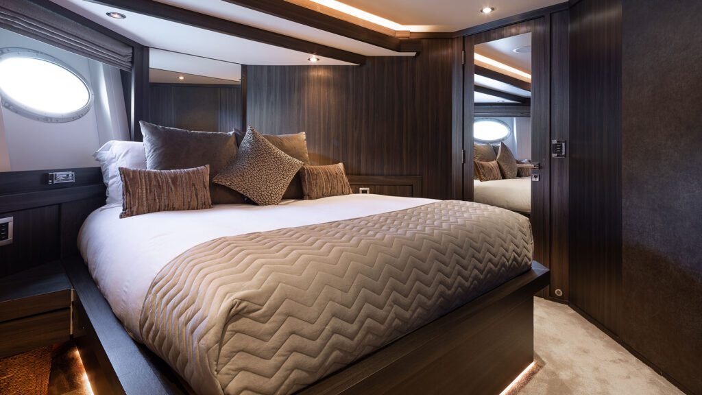 Accommodating up to nine guests in four cabins, the layout includes a spacious full-beam master suite, two VIP doubles, and one twin cabin with an additional Pullman berth. All cabins are ensuite and located on the lower deck.