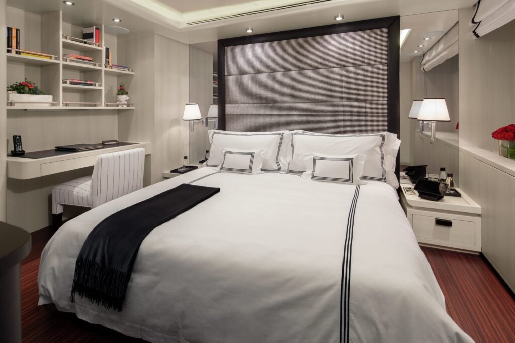 Eternity accommodates up to 12 guests across seven suites. The layout includes a master stateroom on the main deck, four guest doubles, and two twin cabins with additional Pullman bunks. The master suite features a walk-in wardrobe, his-and-hers en suite bathrooms with a Jacuzzi tub, and a private balcony for added exclusivity.