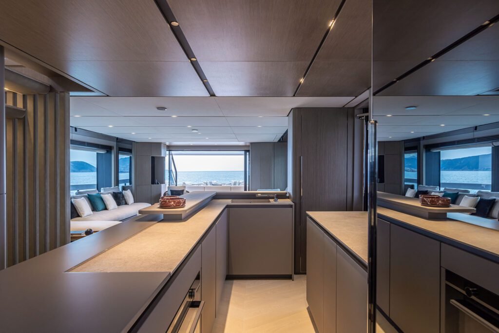 Onboard, guests can indulge in a variety of experiences, including a deck jacuzzi, perfect for savoring the scenery with a refreshing drink. To ensure ultimate comfort, Ferretti Infynito 90 is equipped with air conditioning throughout.