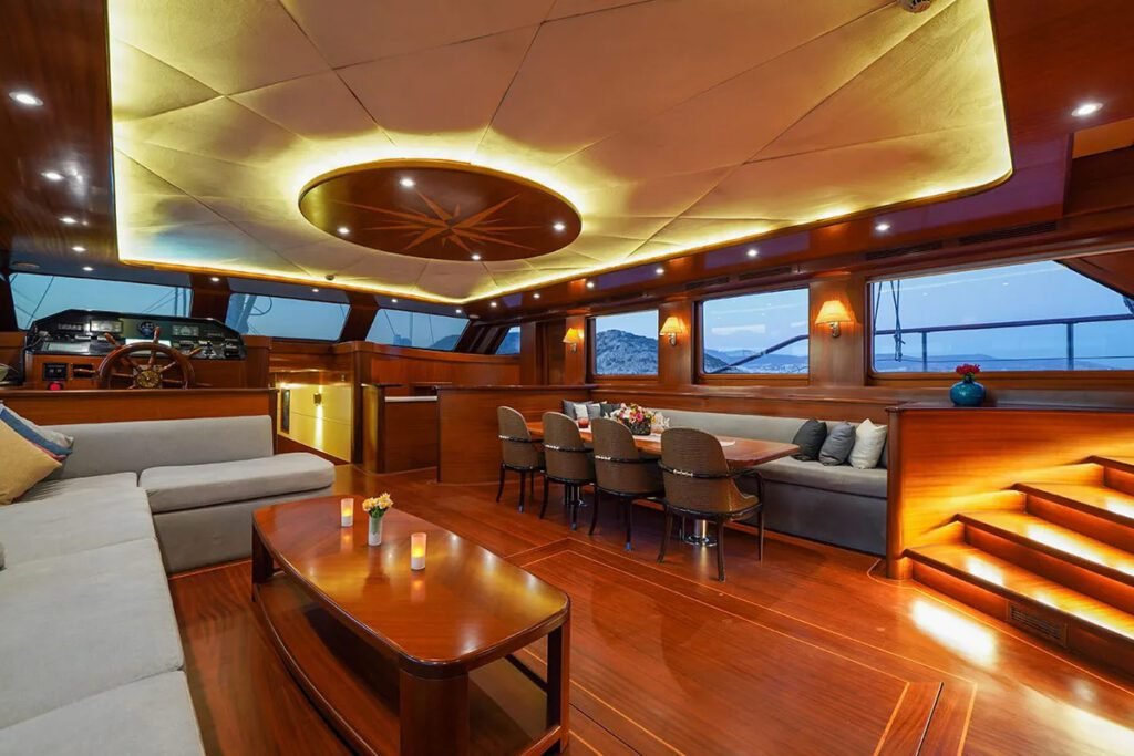 Designed with indulgent space and serenity in mind, the yacht accommodates up to 12 guests in six beautifully appointed cabins, including a full-beam master suite, a VIP stateroom, two double, and two twin cabins—all with private ensuite bathrooms. The main salon stretches across the full beam, featuring plush lounge seating, rich wood detailing, and a formal dining area bathed in natural light.