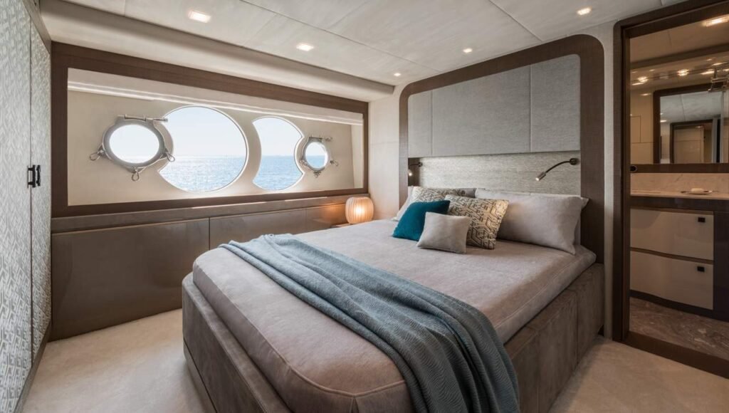 ROCCO accommodates 10 guests across five elegant staterooms, including a luminous master suite on the main deck and four equally comfortable guest cabins below. Soft blue and grey fabrics flow throughout, enhancing the serene atmosphere. A dedicated crew of five ensures a seamless onboard experience. With her blend of performance, comfort, and contemporary design, ROCCO is the ultimate escape for those seeking a refined and unforgettable charter at sea.
