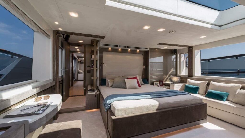 Her expansive main deck aft includes two fold-out balconies, a generous swim platform, and multiple alfresco lounging areas, offering guests an instant sense of space and ease. The stunning flybridge is perfect for socializing, featuring a service bar, stylish sofa, coffee table, sunbeds, and both covered and open areas for all-day enjoyment. Inside, ROCCO exudes refined sophistication with Nuvolari Lenard’s signature décor—marble accents, warm wooden floors, and plush leather furnishings. The main salon invites relaxation with its L-shaped sofa, bean bags, coffee table, pop-up TV, and large windows that flood the space with natural light. Guests can also step out onto the fold-down balconies with a drink in hand to enjoy the sea breeze.